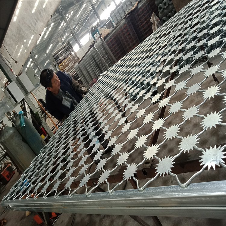 H、檢查各連接部位是否連接牢固、驗收、技術要求刀刺隔離網所有部件,應滿足防腐、表面平整、耐老化、耐酸堿、不褪色等要求。隔離網主要部件采用浸塑防腐處理,連接緊固件采用防盜專用螺栓,刀刺網和連接緊固件應采用不銹鋼材,整體防腐年限應不低于10年。刀片剌網由銳利尖角不銹鋼制作,張力鋼絲做芯線組合而成的阻絕器材。