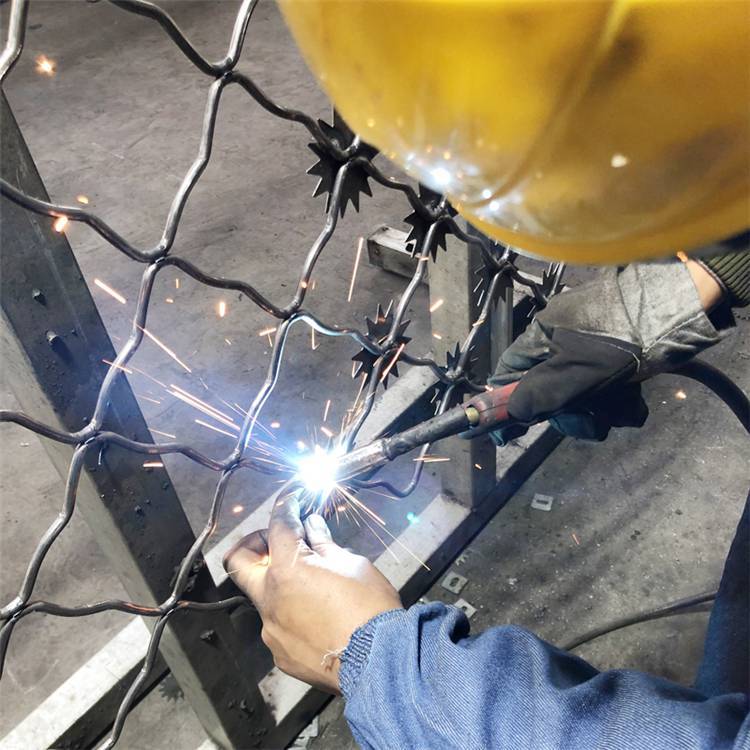 1、太陽(yáng)花刺片:太陽(yáng)花刺片直徑一般不小于7.5cm (直徑6cm、7cm、8cm) , 刺片厚1.5mm,采用Q235低碳鋼板沖壓成型。太陽(yáng)花剌片用氬弧焊將太陽(yáng)花形刺片焊接在美格網(wǎng)的節(jié)點(diǎn)上,形成刺形保護(hù),有效的防止了手握腳攀。