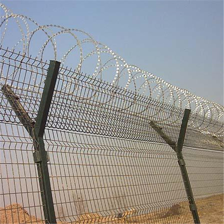 監獄鋼網墻又稱作“Y型安全防御護網”,是由V型支架立柱,加強型焊接片網,安全防盜連接件和熱鍍鋅刀片刺籠組成強度和安全防御性級別很高。近年來,被廣泛應用在監獄,軍事基地等高安全場所。在監獄鋼網墻頂部加裝刀片剌絲、刀片剌繩后又很好的增強了安全防護性能。采用電鍍、熱鍍、噴塑、浸塑等防腐形式,具有很好的抗老化抗曬、耐候等特點。產品造型美觀、花色多樣,既起到圍欄作用,又起到美化作用。由于具有安全性高、防攀爬能力好網片連接方式采用特制sbs緊扣件,有效防止人為的破壞性拆卸橫向四道折彎加強筋,使網面強度顯著增加。