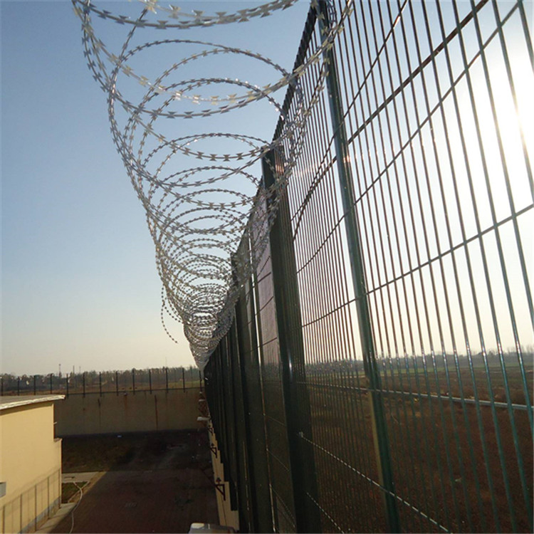 監獄隔離網是一種新型防護網,也叫Y型刀片護欄網,它由銳利尖角鍍鋅鋼板或不銹鋼薄板做成刀片刺網,鋼絲做芯線組合而成的監獄圍墻防護利器!監獄隔離網具有嚇阻、防翻越等效果。監獄隔離網可平地安裝,也可在圍墻上二次安裝,有效防止攀逃。直刺式刺網隔離帶,是用柱體和普通刺繩橫、縱、斜向交叉綁定成刺網隔離帶。 監獄隔離網的材質堅硬,具有高強度,高張力,造型設計獨特,不宜觸摸,因而能達到防護隔離效果。