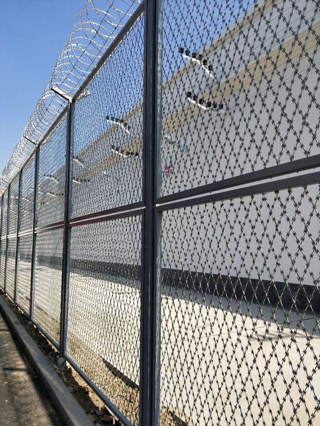 監(jiān)獄鋼網(wǎng)墻又稱(chēng)作"Y型安全防御護(hù)網(wǎng)”,是由V型支 架立柱加強(qiáng)型焊接片網(wǎng),安全防盜連接件和熱鍍鋅刀片刺籠組成強(qiáng)度和安全